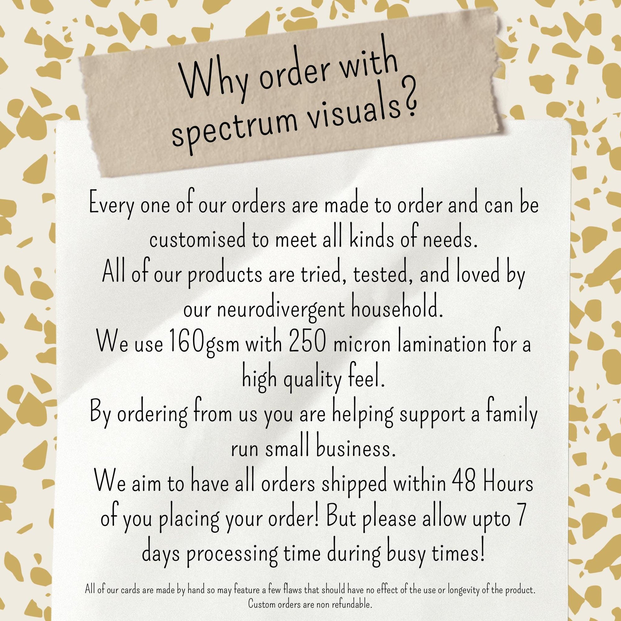 At Spectrum Visuals, we believe great resources should be accessible to everyone. We create thoughtfully crafted visual solutions and products designed with support, communication and independence at their heart.